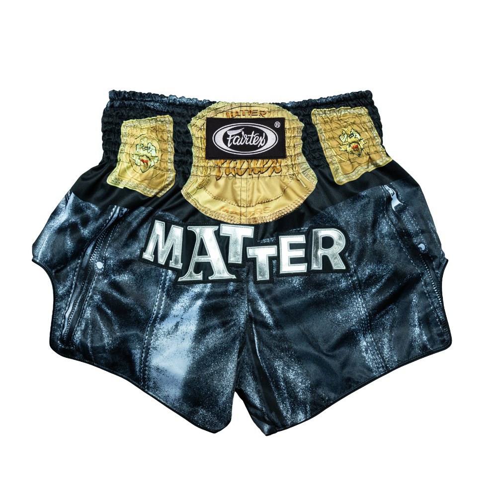 The Fairtex x MATTER MAKERS Championship Belt Muay Thai Shorts celebrate victory with bold belt-inspired detailing and authentic fight performance.